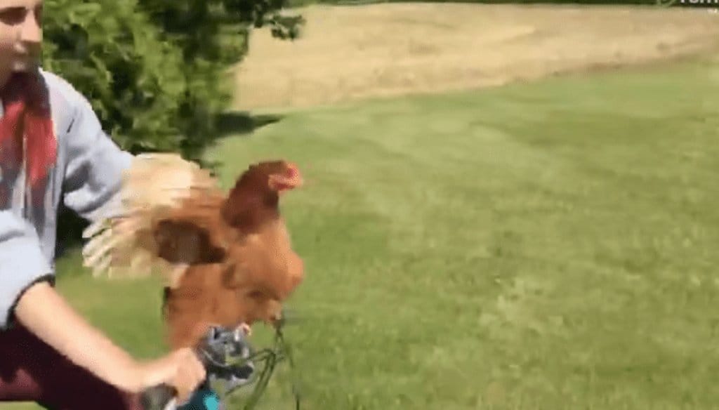 This unusual chicken enjoys joining their human for a relaxing bike ride.Turns out that chicken is not the only chicken who enjoys a bit of cycling. Here's one in Denmark. They're a silkie chicken.Look at that cute blue helmet.Chicken on a bicycle!...