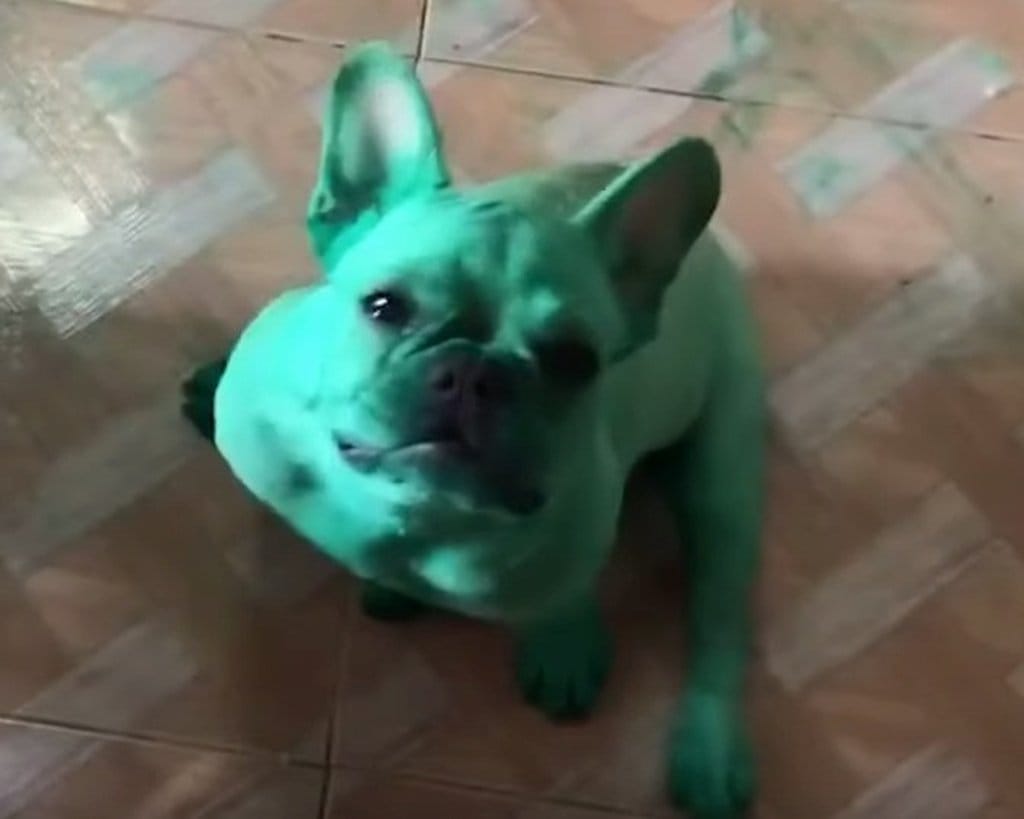 We're told that these French bulldogs made mischief with a bag of green food coloring but I suspect that an accidental overdose of gamma radiation altered their body chemistry....